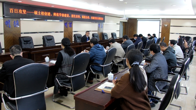 为进一步落实学校育人强校百日攻坚行动工作部署,4月13日上午,我校在行政楼四楼会议室召开百日攻坚行动工作研讨推进会,就硕士校创建、招生宣传、实验室安全、师范学部建设和银校合作等攻坚项目进行研讨。校党委委员、副校长张君诚,组织部、教务处(研究生处)、发展规划处、网络中心(信息化建设办公室)、师范学部等部门负责人参加会议。