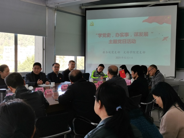 自党史学习教育开展以来,文化传播学院坚持把 “为师生办实事”的各项要求与部署落到实处,深入了解教学需求,集中解决突出问题,力促学院教育事业更上一层楼。12月1日下午,“学党史,办实事,谋发展”主题党日活动于鸿文楼召开,教务处党支部与文化传播学院党支部的全体党员出席了本次活动。