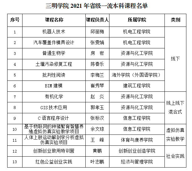近日,福建省教育厅公布了2021年省级一流本科课程名单,三明学院13门课程入选,其中线下一流课程6门、线上线下混合式一流课程3门、虚拟仿真实验教学一流课程2门以及社会实践一流课程2门。