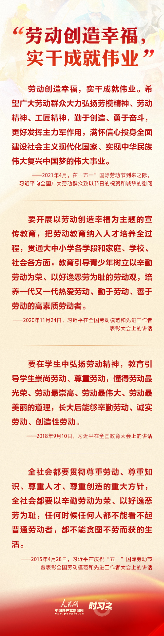 劳动创造幸福,实干成就伟业。习近平总书记始终心系全国广大劳动者,提倡弘扬劳动最光荣、劳动最崇高、劳动最伟大、劳动最美丽的社会风尚。在“五一”国际劳动节到来之际,让我们牢记总书记的殷殷嘱托,树立正确的劳动观。