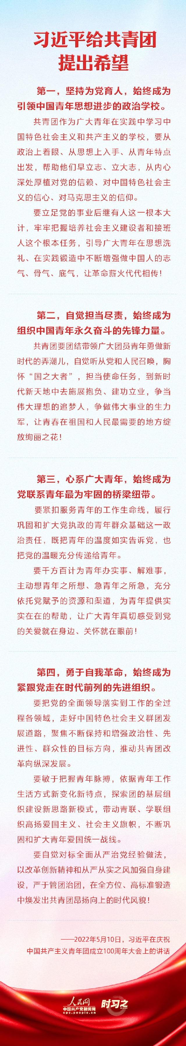 5月10日上午,庆祝中国共产主义青年团成立100周年大会在北京人民大会堂隆重举行。中共中央总书记、国家主席、中央军委主席习近平出席大会并发表重要讲话。讲话中,习近平总书记给共青团、广大共青团员、广大团干部提出了希望。