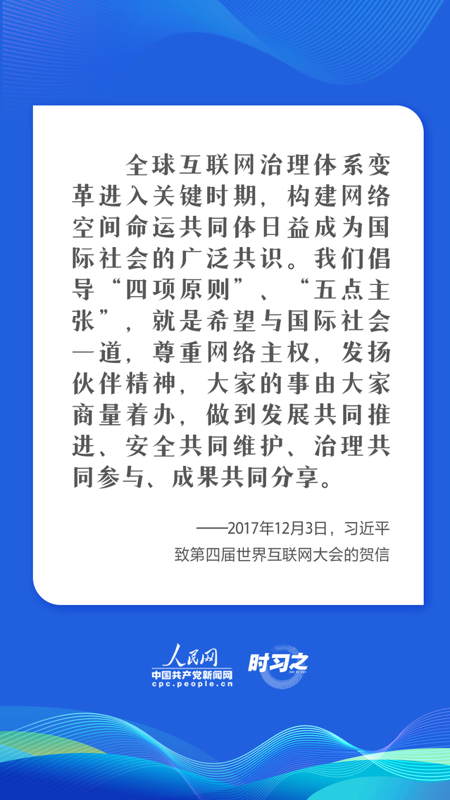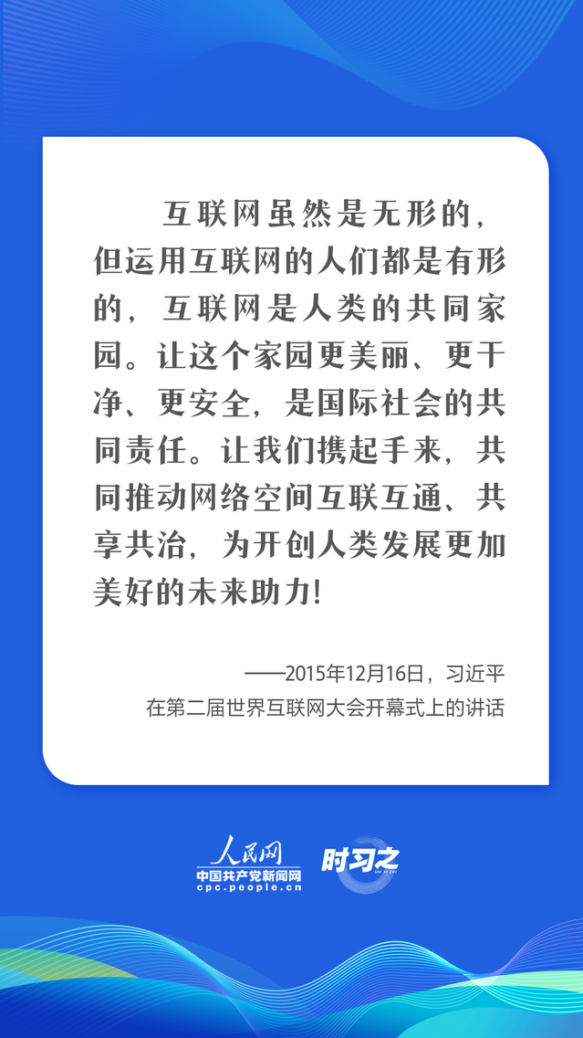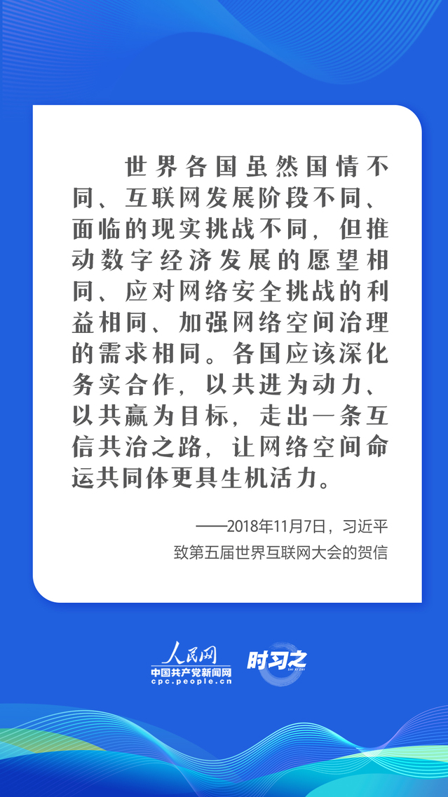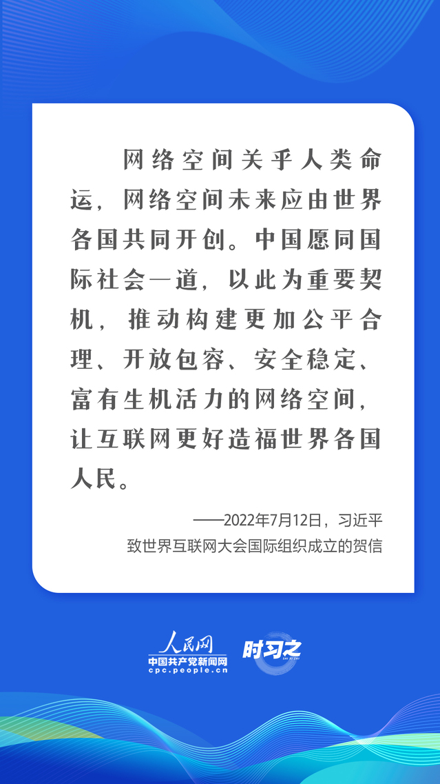 7月12日,国家主席习近平向世界互联网大会国际组织成立致贺信。他强调,网络空间关乎人类命运,网络空间未来应由世界各国共同开创。这些年,习近平数次就互联网发展大势、网络空间治理作出重要论述,并多次在不同场合发出“中国倡议”,为世界互联网发展凝聚合力。