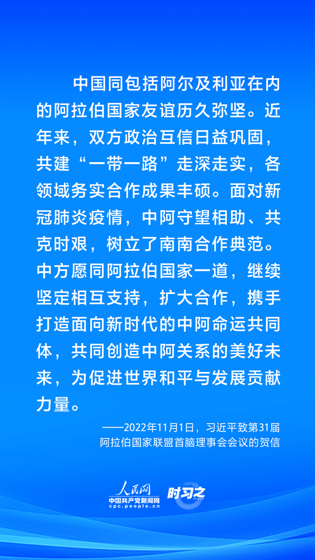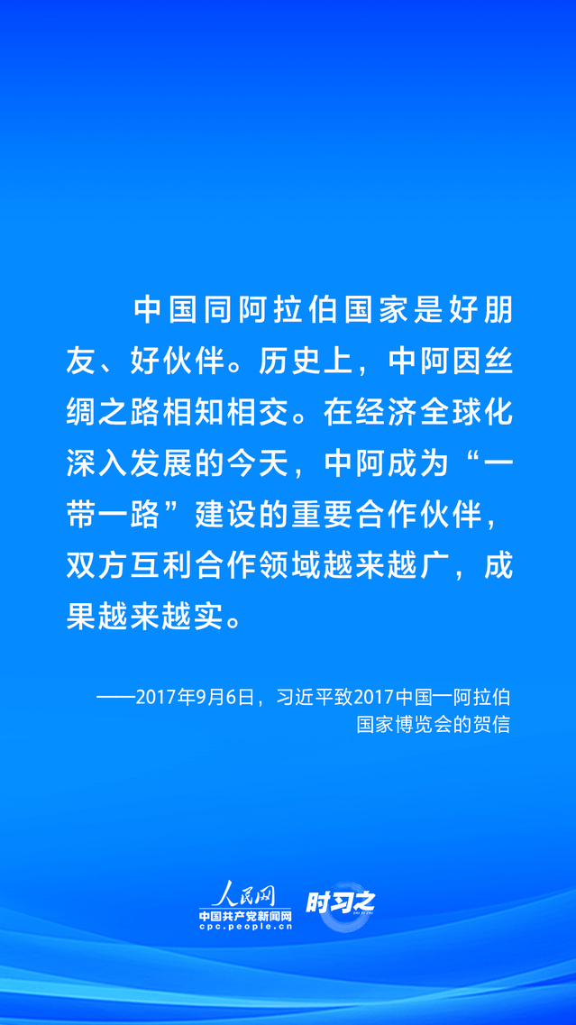 中国与阿拉伯国家友谊源远流长,历久弥坚。和平合作、开放包容、互学互鉴、互利共赢始终是中阿交往的主旋律。习近平主席多次在不同场合谈到中阿友谊,提出携手打造面向新时代的中阿命运共同体,积极推动中阿命运共同体建设不断走深走实,造福双方人民。