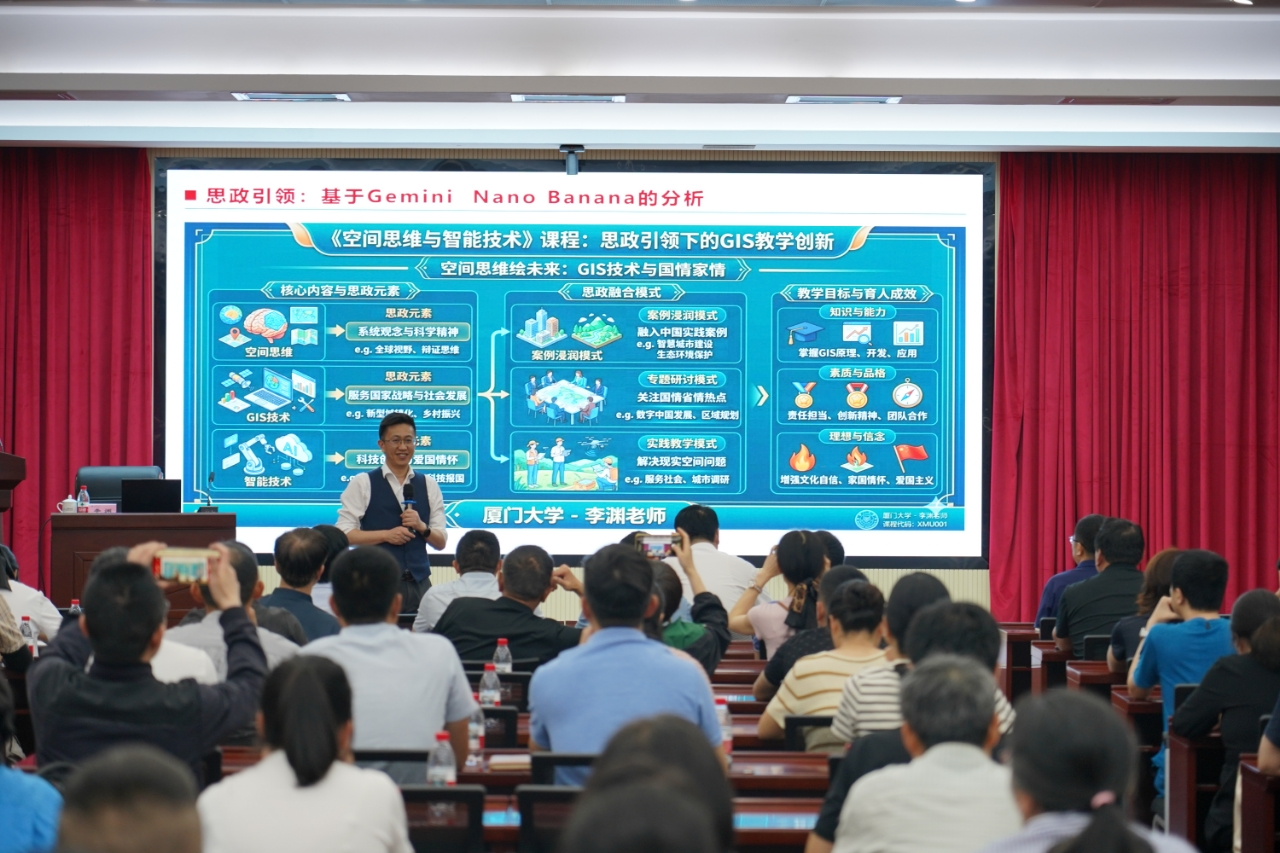 李渊教授结合国家级一流本科课程建设、参加全国高校教师教学创新大赛等经验,以《城乡规划新技术GIS应用》《国土空间规划信息技术》等课程为例,分享课程思政有机融入专业教学、产教融合与科教融汇协同育人的实施路径,系统总结“人工智能+多元图谱+任务引擎+元宇宙教室”四位一体的智慧课程建设模式。他详细阐述如何利用知识图谱重构课程知识体系、借助任务引擎驱动学生自主学习、依托元宇宙教室拓展教学场景边界,重点介绍AI智能体在个性化学习辅导中的典型应用,为在场教师提供了清晰可行、易于借鉴的智慧课程建设实践方案。