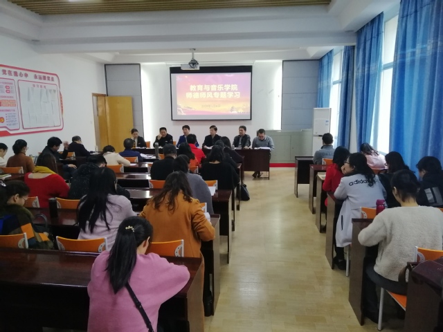 1月8日下午,教育与音乐学院在理工一224会议室召开全体教职工大会,进行师德师风专题学习教育。