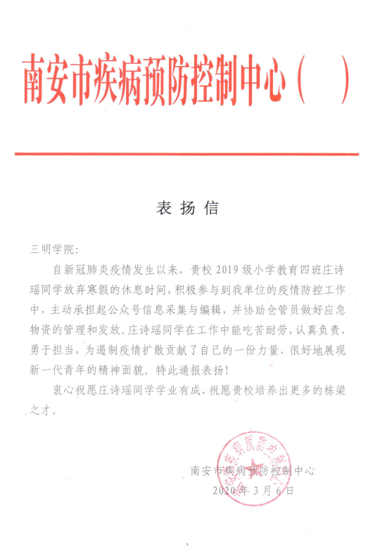 庄诗瑶的行动得到了南安市疾控中心的高度赞赏。表扬信中写道:“庄诗瑶同学在工作中能吃苦耐劳,认真负责,勇于担当,为遏制疫情扩散贡献了自己的一份力量,很好地展现新一代青年的精神面貌!”