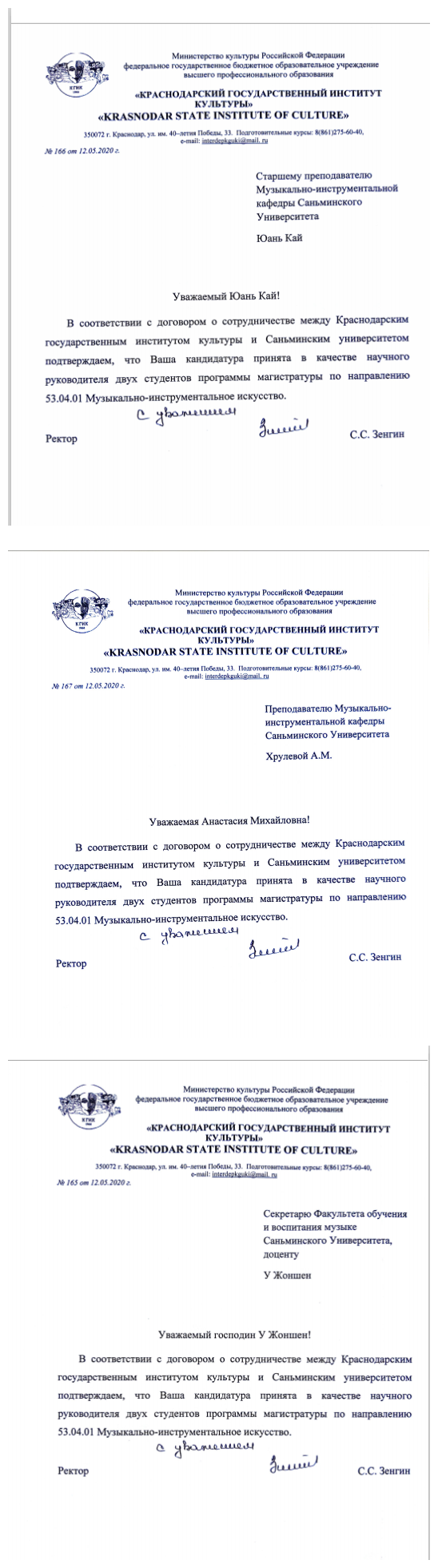 在校党委的关心支持,挂院与分管领导的强力推进及国际处的共同努力下,2020年5月12日,三明学院教育与音乐学院伍荣生、元凯、娜斯佳三名教师受聘于俄罗斯克拉斯诺达尔国立文化学院,担任该校硕士生导师,指导音乐学学生的硕士论文,进一步推进我校“一带一路”国际交流与合作建设,为创硕士校工作添砖加瓦。