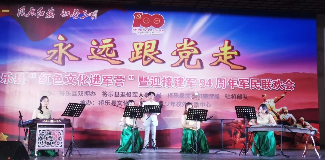 五位同学们正认真的排练,积极的参与演出,在辅导员梁思宇老师的建议和指导下进行调整和练习。晚会在歌曲蒋雨晨和谢欣怡演唱的《这世界那么多人》中拉开了帷幕。黄栋、曾张渝、陈鑫等同学为观众们献上了充满民族韵味的器乐演奏《赤伶》,展现了大无畏的精神,表达了爱国情怀以及对军人们的敬意。