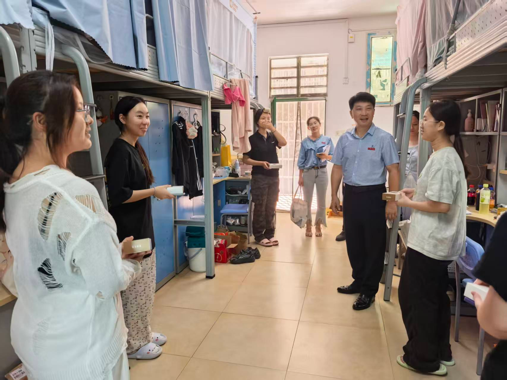 9月29日上午,在国庆、中秋双节来临之际,为深入推进“一站式”学生社区建设,教育与音乐学院党委书记伍荣生、副书记缪大旺、组织员林晨芳及辅导员陈建魁一同走进学生宿舍,开展安全检查和节日慰问,为同学们送去关怀与祝福。