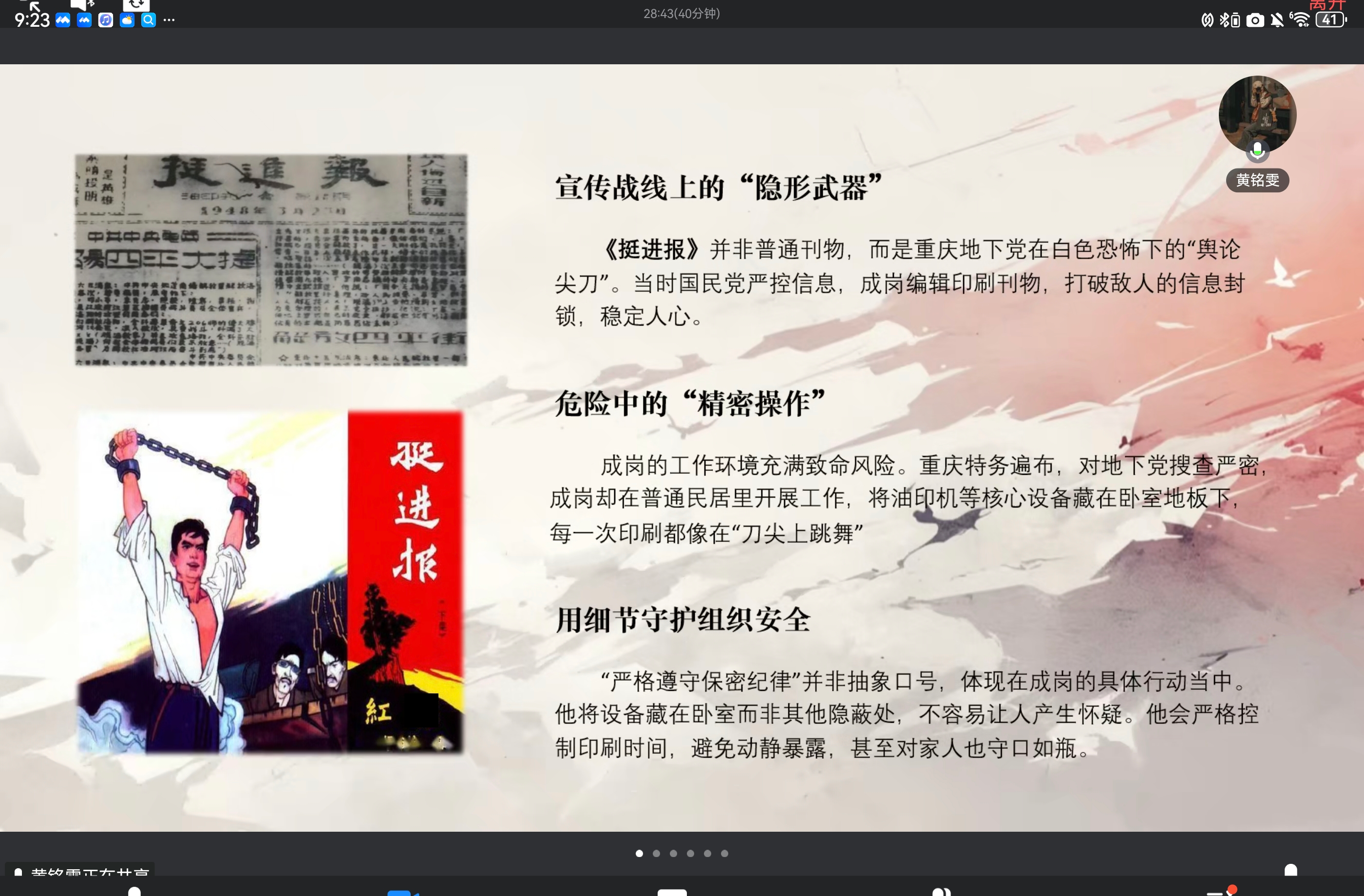 10月30日,中共三明学院教育与音乐学院小学教育专业学生党支部以线上形式,成功举办了一场以“筑牢信仰之基,传承红色基因”为主题的党日活动。本次活动深度融合理论学习与红色经典阅读,包含集体学习党的二十届四中全会精神与《红岩》读书分享会两大议程,支部全体党员积极参与。