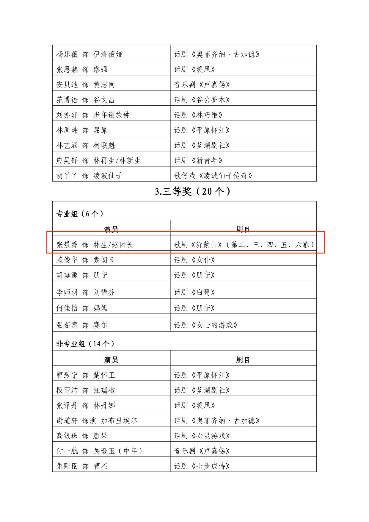 个人奖项方面,朱纭、蔡雨欣凭分别借在《沂蒙山》中成功塑造海棠、夏荷两角,双双荣获专业组一等奖;余孟楠、张景舜也因在该剧中的出色表现,分获专业组二、三等奖。李念橙在梅林戏《金溪河畔女红军·狱中托孤》中饰演黄木珠,以真挚感人的表演荣获非专业组一等奖,展现出学院艺术教育的广泛基础与人才挖掘能力。