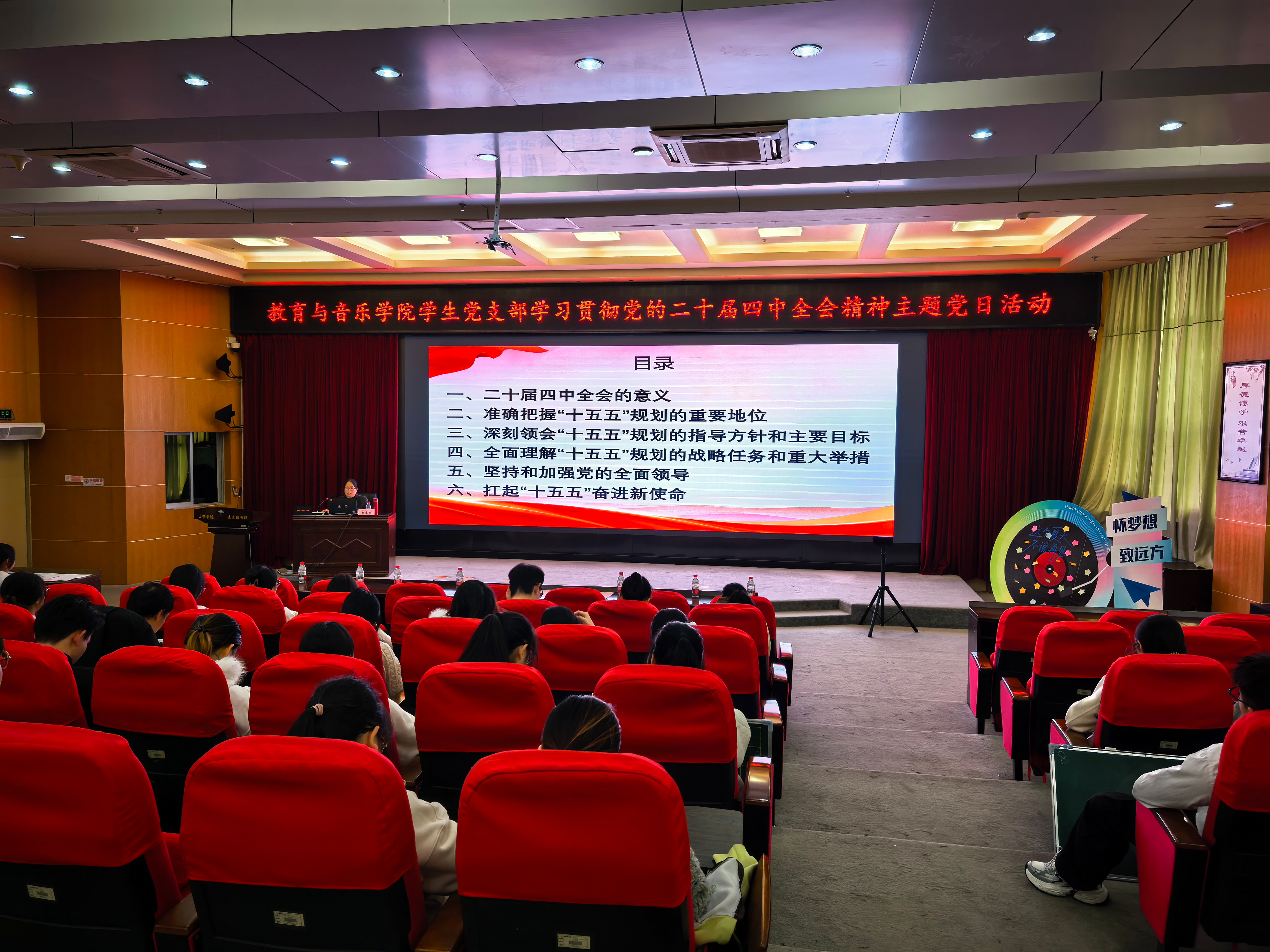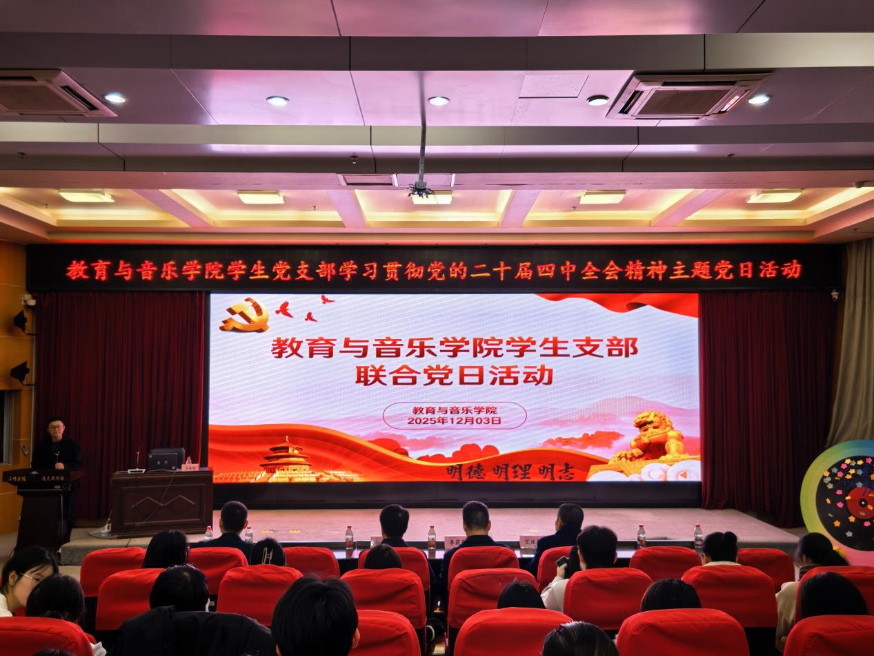 为深入学习贯彻党的二十届四中全会精神,引导青年学子坚定理想信念、强化使命担当,12月3日,教育与音乐学院学生党支部在图书馆学术报告厅举办了一场别开生面的“学思践悟新思想,青春建功新时代”主题党日活动。校党委副书记李莉星、院党委书记伍荣生、院长艾述华、院党委副书记缪大旺出席活动,学院全体在校学生党员与入党积极分子积极参与。