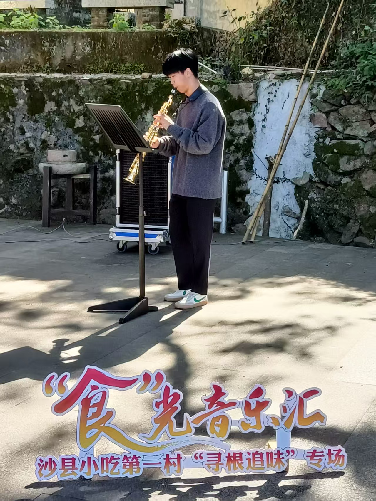 在俞邦村寻根追味街大樟树下,师生党员组成 “党员文艺志愿服务队”,以沙县小吃文化、乡村振兴故事为创作灵感,带来了一场沉浸式街头演出。党员学生改编的民谣《俞邦红・小吃香》,将扁肉制作的 “千锤百炼”、芋饺传承的 “匠心坚守” 融入歌词旋律,生动诠释了非遗文化的时代价值;师生党员合奏的《苏区振兴曲》,以激昂的节奏展现革命老区发展新貌,吸引考察团成员、村民驻足聆听,现场掌声不断。演出间隙,党员教师带领学生开展 “美育浸润微课堂”,与村民、游客互动教学,传授基础乐理知识、指导乐器演奏技巧,让美育之花在乡村土壤中落地生根。