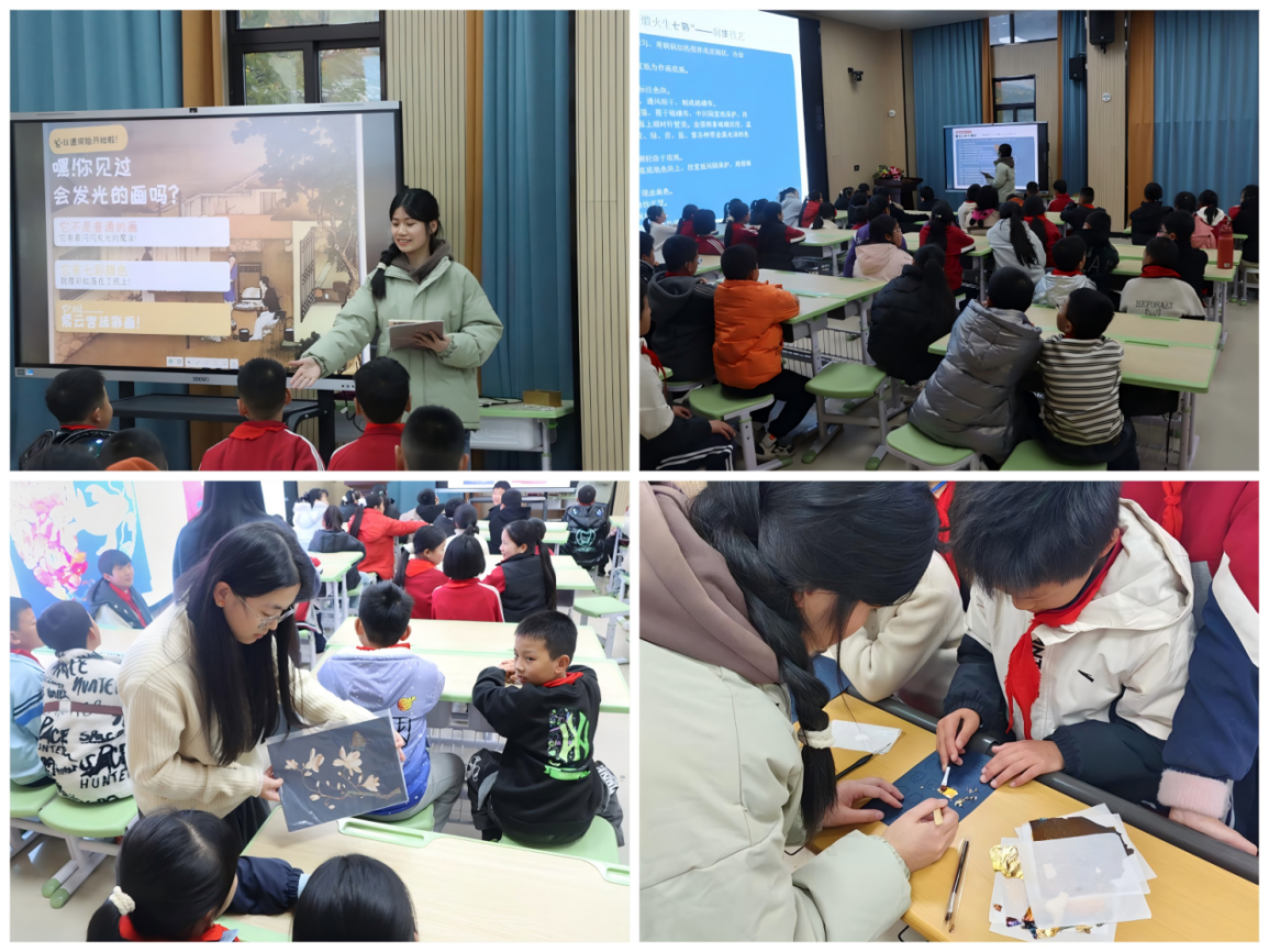 非遗的活态传承需扎根教育土壤。1月21日下午,“栖羽金窗”实践团队将紫云金箔彩画带入三明学院附属实验小学,设计“非遗探险之旅”系列课程,通过历史溯源、技艺演示、亲手贴箔等七个互动环节,让小学生在光影流转中感受传统魅力。团队成员朱妍以生动语言讲解白鹇的吉祥寓意与金箔工艺的千年传承,并引导孩子们动手尝试简易贴箔步骤。