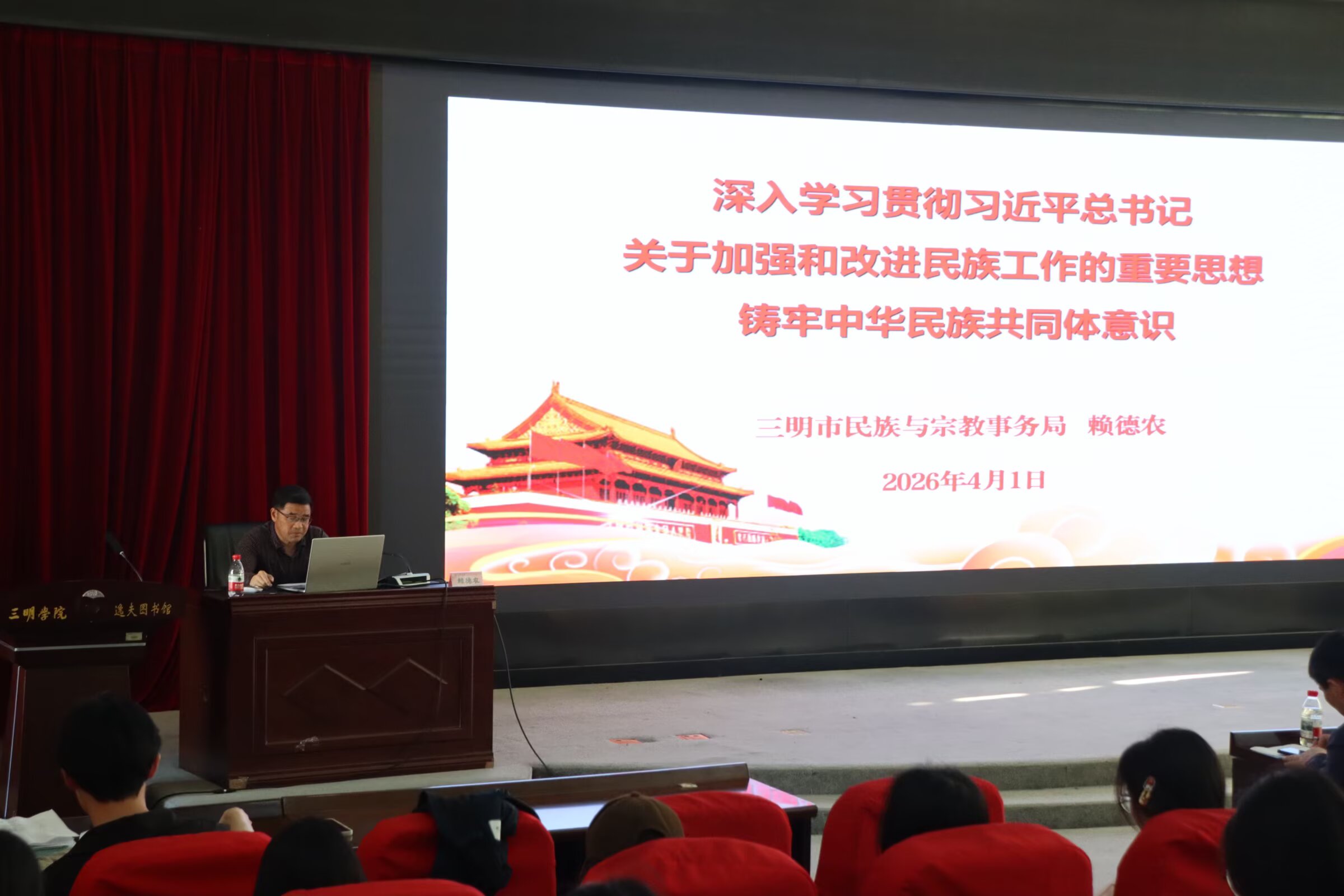 4月1日下午,为深入推进“福籽同心”嘉年华系列活动,有形有感有效铸牢中华民族共同体意识,教育与音乐学院在图书馆四楼学术报告厅举办“思想领航 共育石榴籽”专题宣讲活动。三明市民族宗教事务局副局长赖德农,三元区委民族宗教事务局、三元公安分局巡特警反恐大队等单位专家受邀来校宣讲。教育与音乐学院领导班子成员、辅导员及各民族学生代表近200人参加活动。