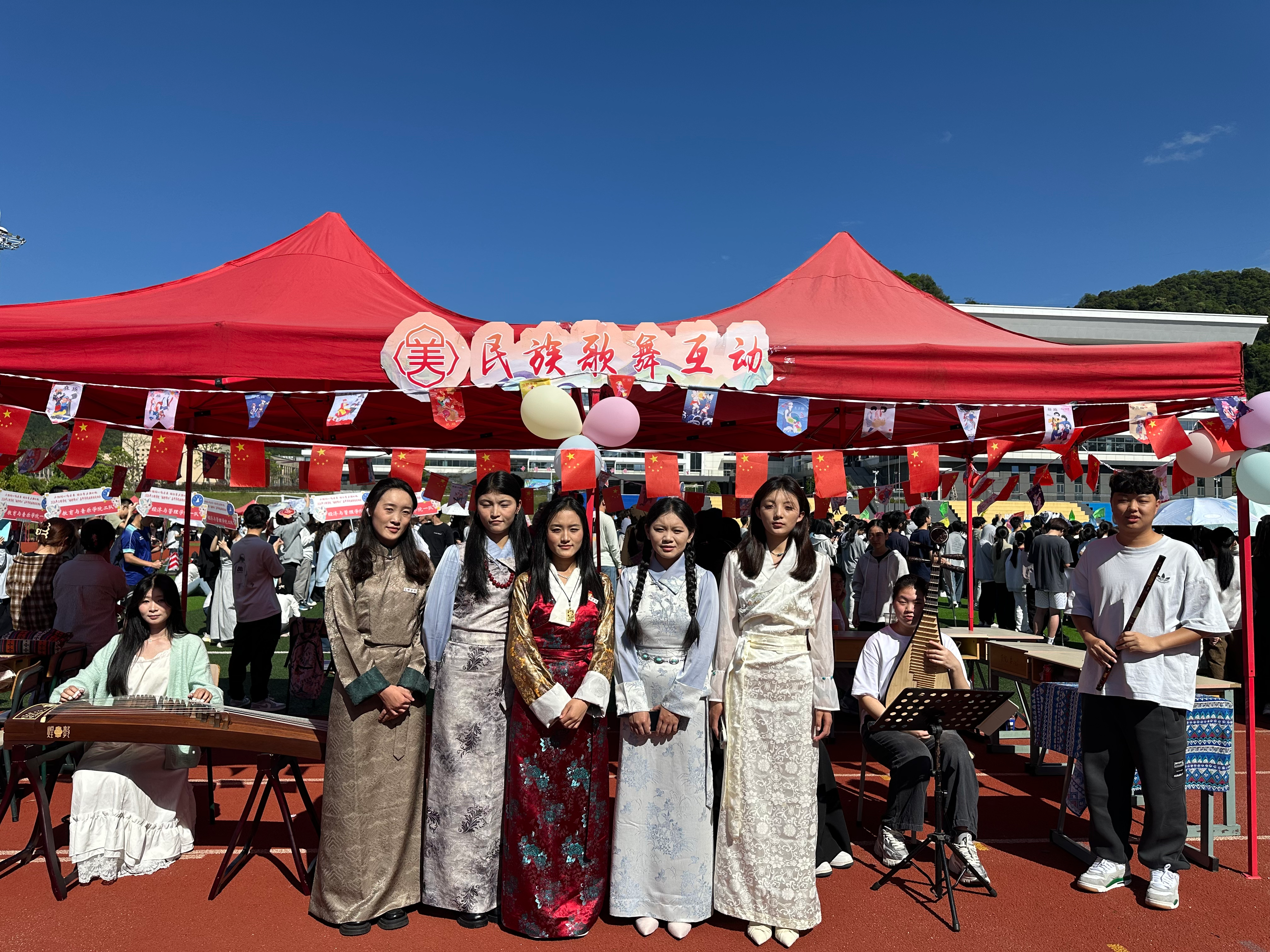 随后,党员学生化身文化讲解员与教学志愿者,在民族乐器展示区开展展示展演与互动教学。古筝、琵琶、竹笛、芦笙等乐器依次亮相,经典民族曲目悠扬奏响;党员手把手指导各民族同学体验演奏技巧,在交流互动中增进文化认同、拉近民族情谊,为嘉年华营造浓厚艺术氛围,以专业服务践行初心使命。