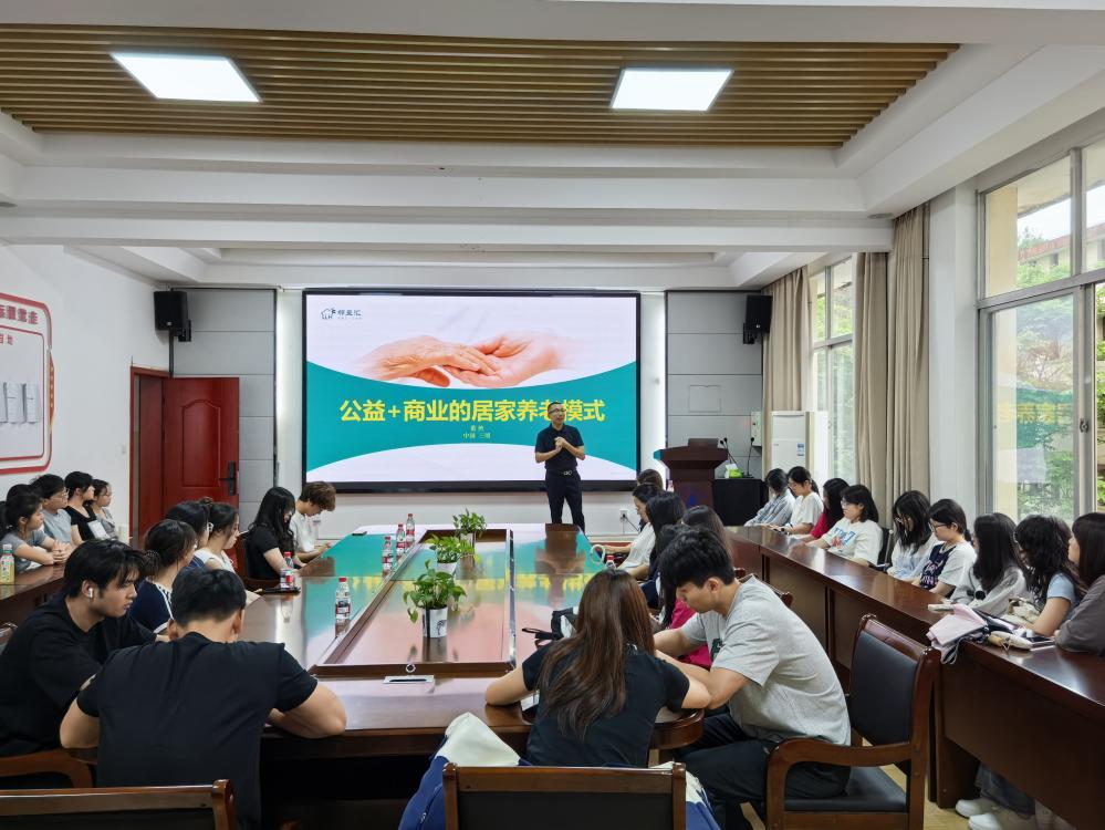 在就业推介中,福建邻里汇健康管理有限公司董事长、教育与音乐学院05级校友董势结合当前养老服务与社区健康产业发展趋势,详细讲解了公益+商业居家养老模式,系统阐述社区居家养老的行业特点、面临的困境与问题、邻里汇企业的破题路径及合作共赢体系,全面展现了邻里汇企业发展模式与行业实践成果。