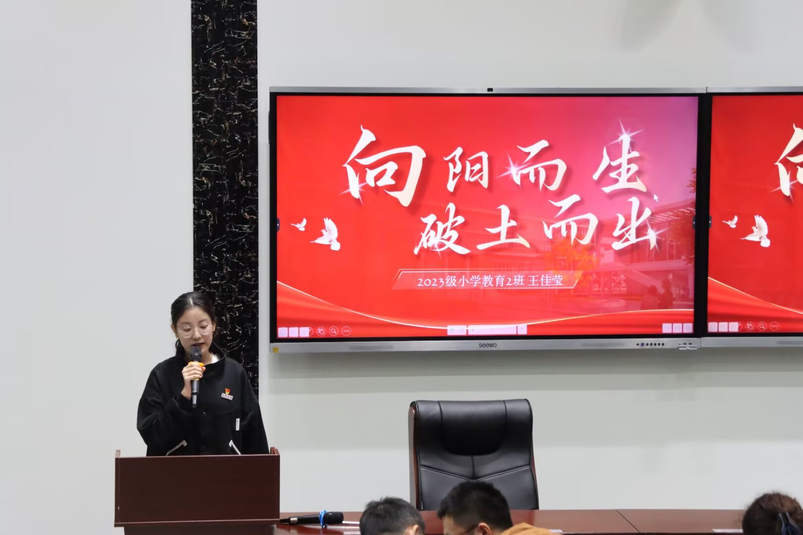国家奖学金获得者王佳莹同学以“向阳而生,破土而出”为主题,结合自身优异的学习表现和丰富的社会实践经历,分享了学习与成长经验,激励同学们笃学力行、追求卓越。