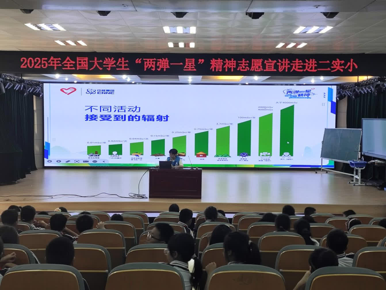 宣讲以生活实例开篇,指出晒太阳就是接触太阳辐射,说明辐射普遍存在于空气、土地及人体中,且这些微量放射性物质不会影响健康。为帮助孩子区分辐射种类,宣讲员用比喻说明:电离辐射能量大但日常接触少,电磁辐射常见于灯光、微波炉等设备,对人体无害。同时,宣讲员用数据强调,正常运行的核电站年额外辐射量,不足普通人从土壤中受辐射量的十分之一。