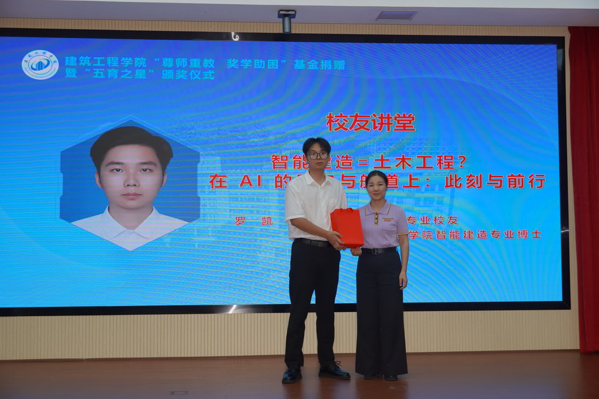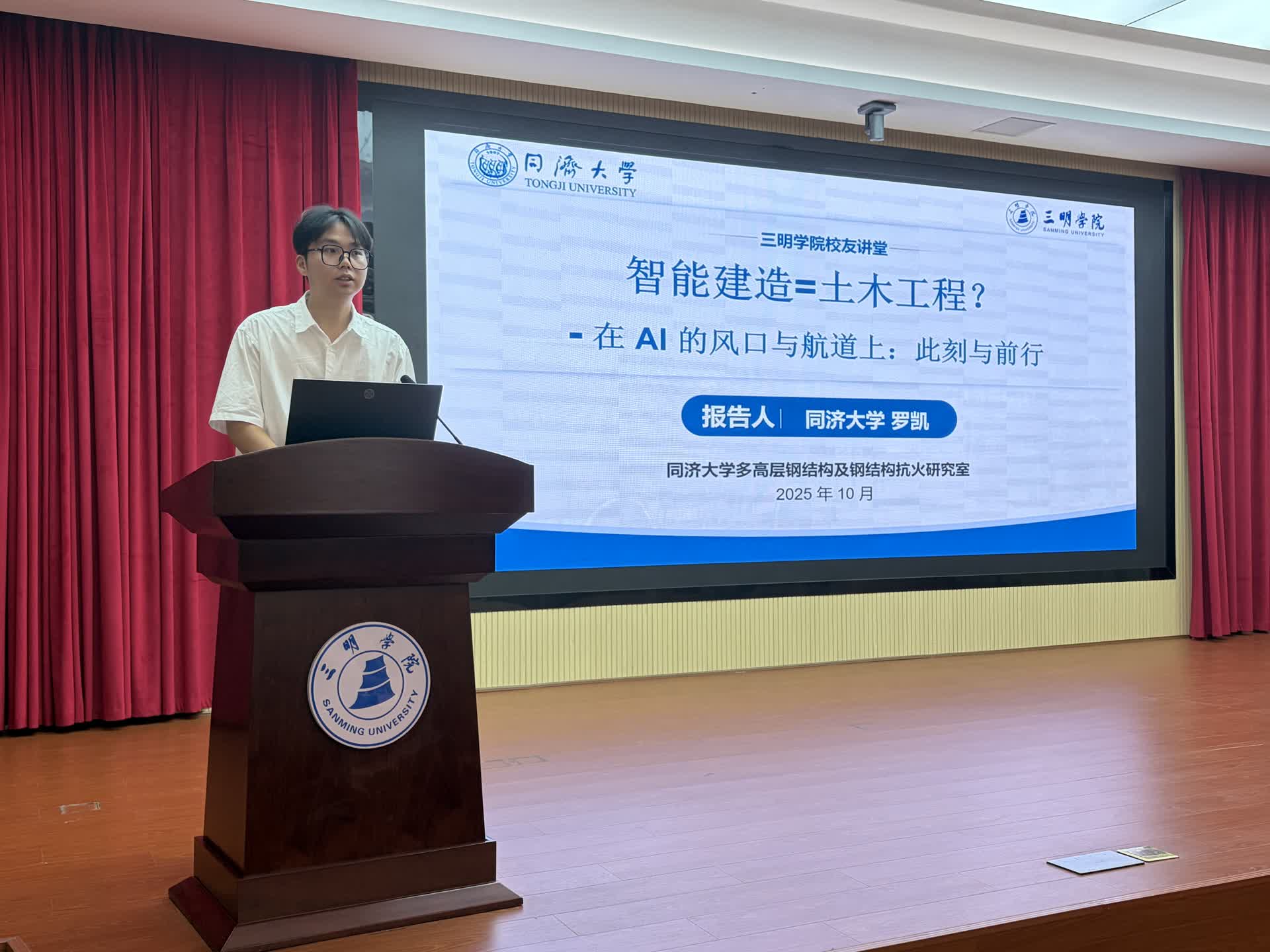 10月17日,我院校友讲堂在行政楼附楼第三会议室隆重开讲。本次讲堂特邀2022届校友、同济大学在读博士研究生罗凯返校,以“智能建造=土木工程?——在AI的风口与航道上:此刻与前行”为主题,分享求学经验与学术研究成果,助力建工学子明晰行业方向、做好学业规划。院领导、校友代表及师生代表共200余人,共同参与了本次活动。