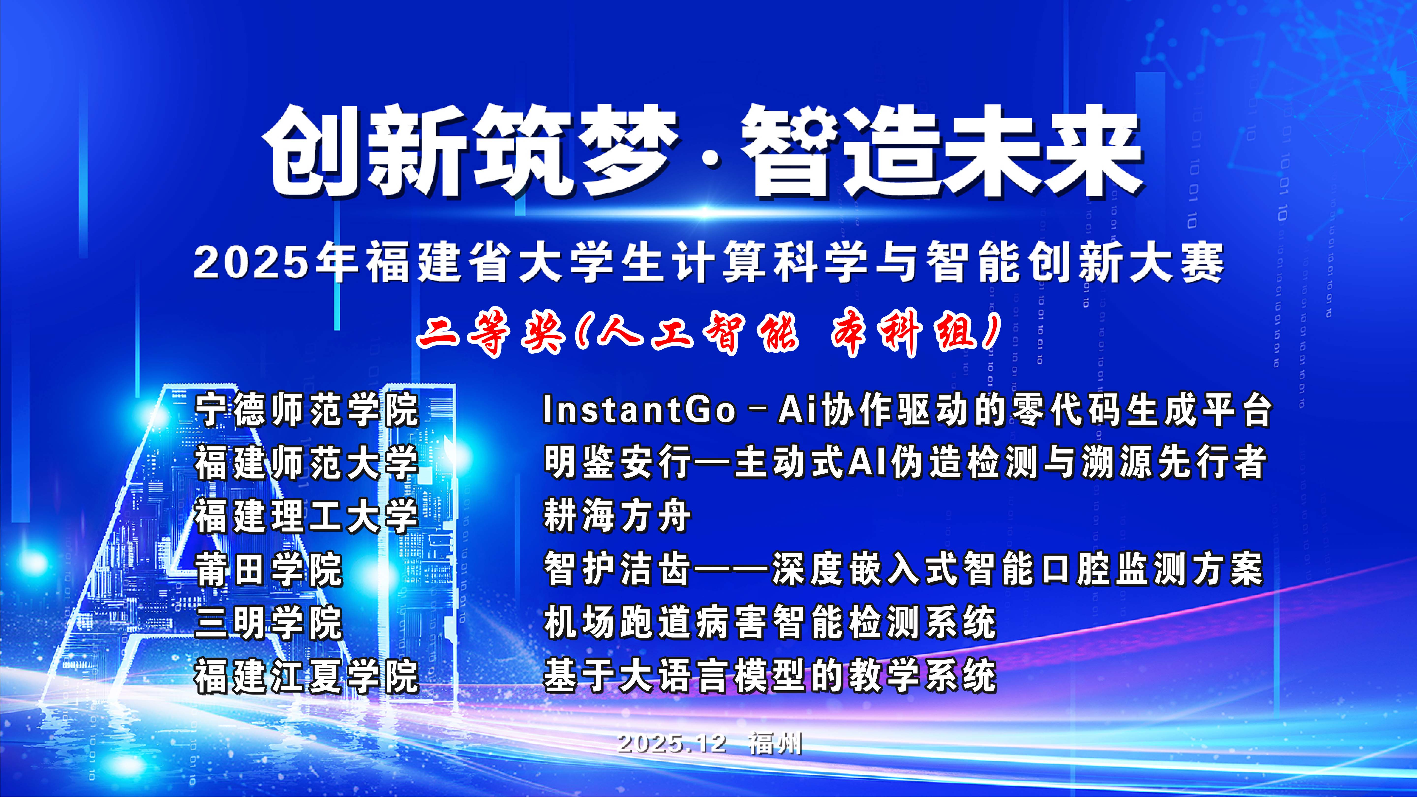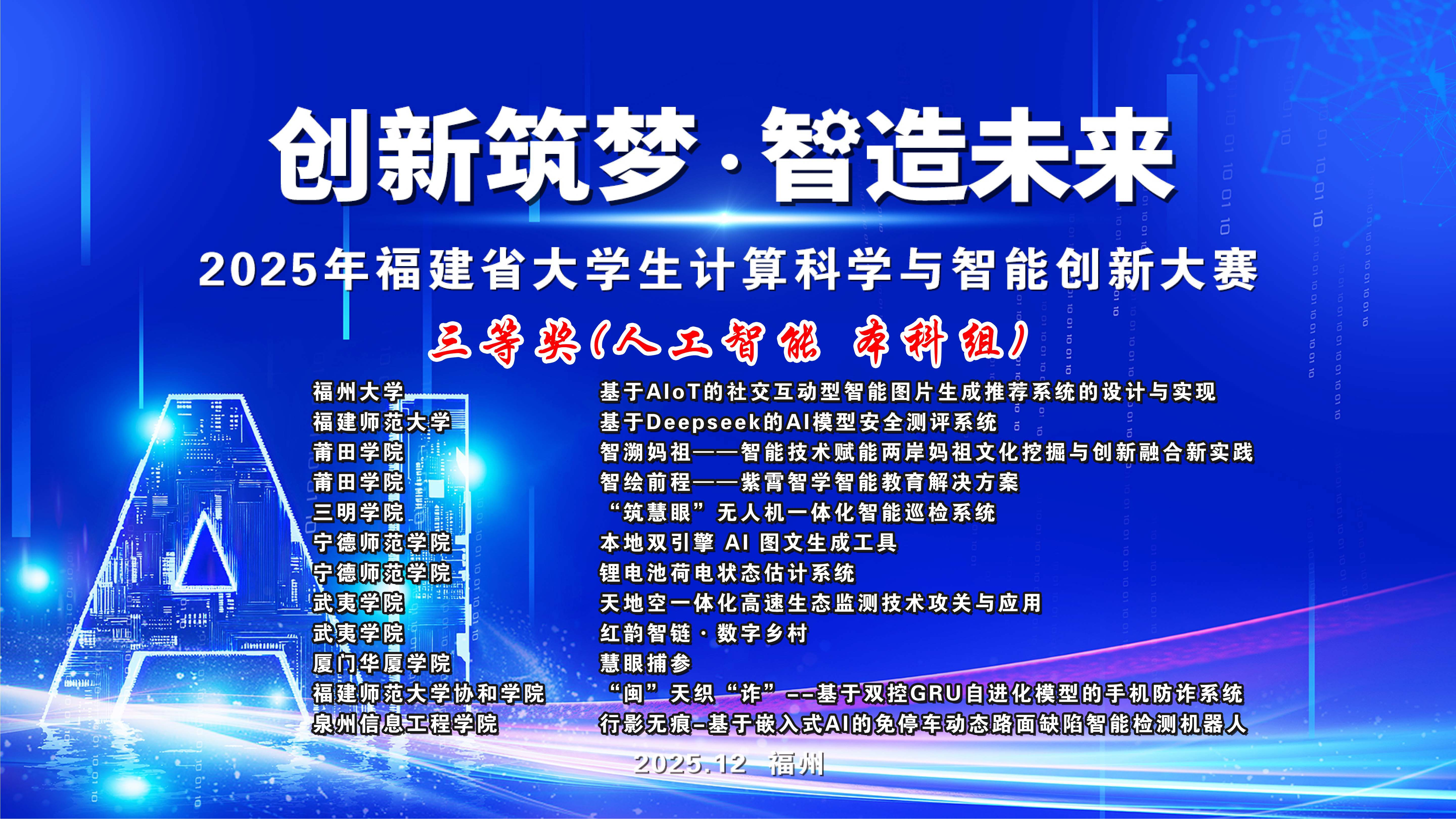 12月14日,由福建省教育厅主办的2025年福建省大学生计算科学与智能创新大赛决赛在福州圆满落幕。我院参赛作品“机场跑道病害智能检测系统”(成员:张宇轩、魏佳鑫、林雨晨,指导老师:周玉珏、王栋)、“‘筑慧眼’无人机一体化智能巡检系统”(成员:兰若伶、郑煜儒、刘萍,指导老师:周玉珏、连跃宗)分别荣获大赛人工智能应用创新赛道(本科组)二等奖和三等奖。
