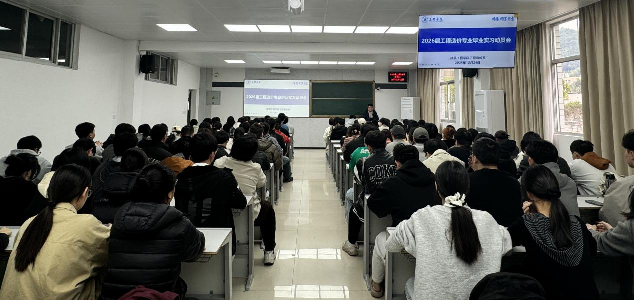 为强化实践教学环节,帮助学生衔接校园与职场,工程造价系于12月24日在博学楼201教室召开了2026届毕业实习动员大会。学院副院长兼工程造价系系主任钟海博士、工程造价专业教师代表及全体2026届毕业生参会。
