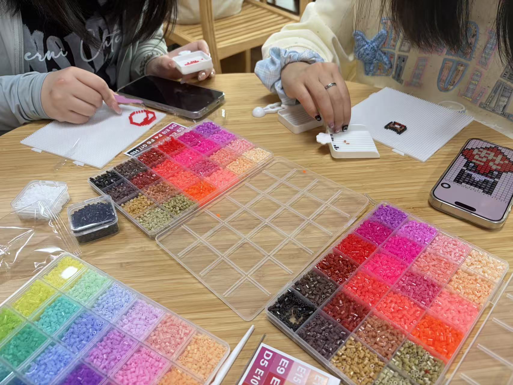活动以“动手的正念冥想”为主线,设置正念导入与沉浸式创作两个环节。在主持人的引导下,参与者放下手机、闭眼深呼吸,将注意力拉回当下。随后,大家在轻音乐中领取物料包,围绕学业压力、情绪调节等主题自由创作拼豆作品。现场“拼豆疗愈区”布置温馨,熨斗等工具由工作人员统一操作,确保活动安全有序进行。