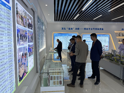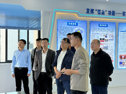 刘政良秘书长一行人来到明理楼三楼科研平台展厅,实地观摩了研究院的成果展示区。在工作人员的介绍下,详细了解了氟化工研究院、沪明绿色氟代制药工程技术研究中心的建设背景、发展历程、团队建设,以及在氟新材料领域的技术研发、成果转化及产学研合作等方面的工作进展。高超鸿博士就研究院在氟化工产业链关键技术攻关、人才培养与社会服务等方面的情况作了详细汇报。