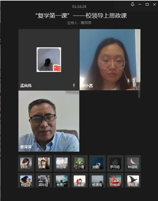 为充分利用疫情防控形成的优质教育素材,讲好疫情防控这堂爱国主义教育大课、思想政治教育大课,引导学生深刻感受中国力量、中国精神和中国效率。把爱国情、强国志、报国行自觉融入到实现中华民族伟大复兴实际行动中。本学期,全体校领导班子成员再次走上思政课讲台,利用网络平台,分别为二级学院学生代表上了一堂特殊的思政课。