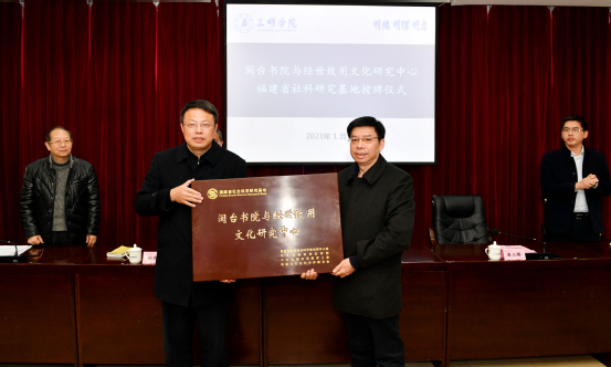 2021年1月12日下午,福建省社会科学研究基地——闽台书院与经世致用文化研究中心授牌仪式在我校举行。福建省社科联党组成员、秘书长、社科规划办陈飞主任、省社科规划办肖孟刚副主任、方宝川、谢必震教授、三明学院校长潘玉腾教授、副校长林建伟教授等领导、专家应邀出席,三明学院相关处室、二级学院负责人、我校2020 年福建省社科研究基地重大项目成员代表及马克思主义学院教师参加授牌仪式。授牌仪式由三明学院校长副校长林建伟教授主持。陈飞向“闽台书院与经世致用文化研究中心”授牌,三明学院校长潘玉腾接受基地牌匾,中国书院学会、台湾书院联谊会特发贺信。授牌仪式结束后接着召开2020 年福建省社科研究基地重大项目成员座谈会。