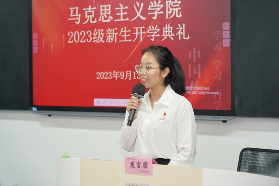 2023级思想政治教育专业周诗语作为新生代表发言,她以《感恩故事的力量》为题,表示在今后的学习生活中,将学习并应用专业知识中所蕴含的信仰、理论与教育的力量,对标优秀校友为榜样,用青春和汗水,去实现美好的人生理想。