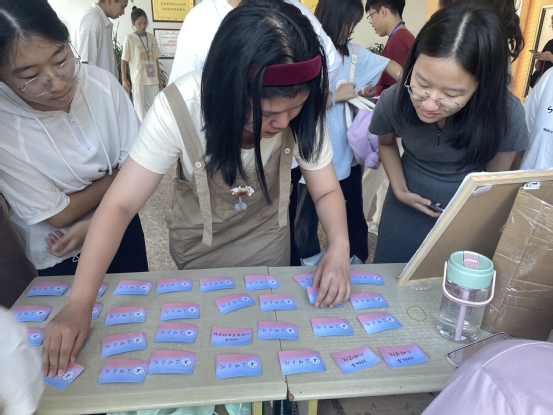在“校名翻翻乐”活动中,主持人将校史中不同时间点的不同校名分成三十二张卡牌,同学们需在三十秒内通过翻动卡面,找出相同卡牌进行消除。看马克思主义学院的苏新娟同学,在三十二张卡牌中不断翻找但始终找不到相同的卡牌,在周边同学们的提示下,她很快就翻出了相同的卡牌并在规定时间内完成了挑战。通过本次活动同学们看到了不同时间点的不同校名,翻动卡面,找出相同的卡牌进行消除。参赛选手认真耐心,翻出快乐,翻出了对明院的认识。