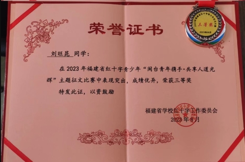 近日,福建省红十字会公布了2023年红十字会青少年征文大赛获奖结果,马克思主义学院2022级思想政治教育专业刘旺昆同学《善行筑桥接台闽,两岸青年心连心》荣获三等奖。