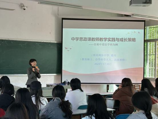 为深入贯彻落实习近平总书记在学校思想政治理论课教师座谈会上的重要讲话精神,3月20日下午,马克思主义学院于明德楼(二)207举办“校友思政讲坛”,本次活动特邀三明市列东中学副校长、三明市学科带头人、高级教师蔡玲主讲,2022级思想政治教育专业全体学生参加。