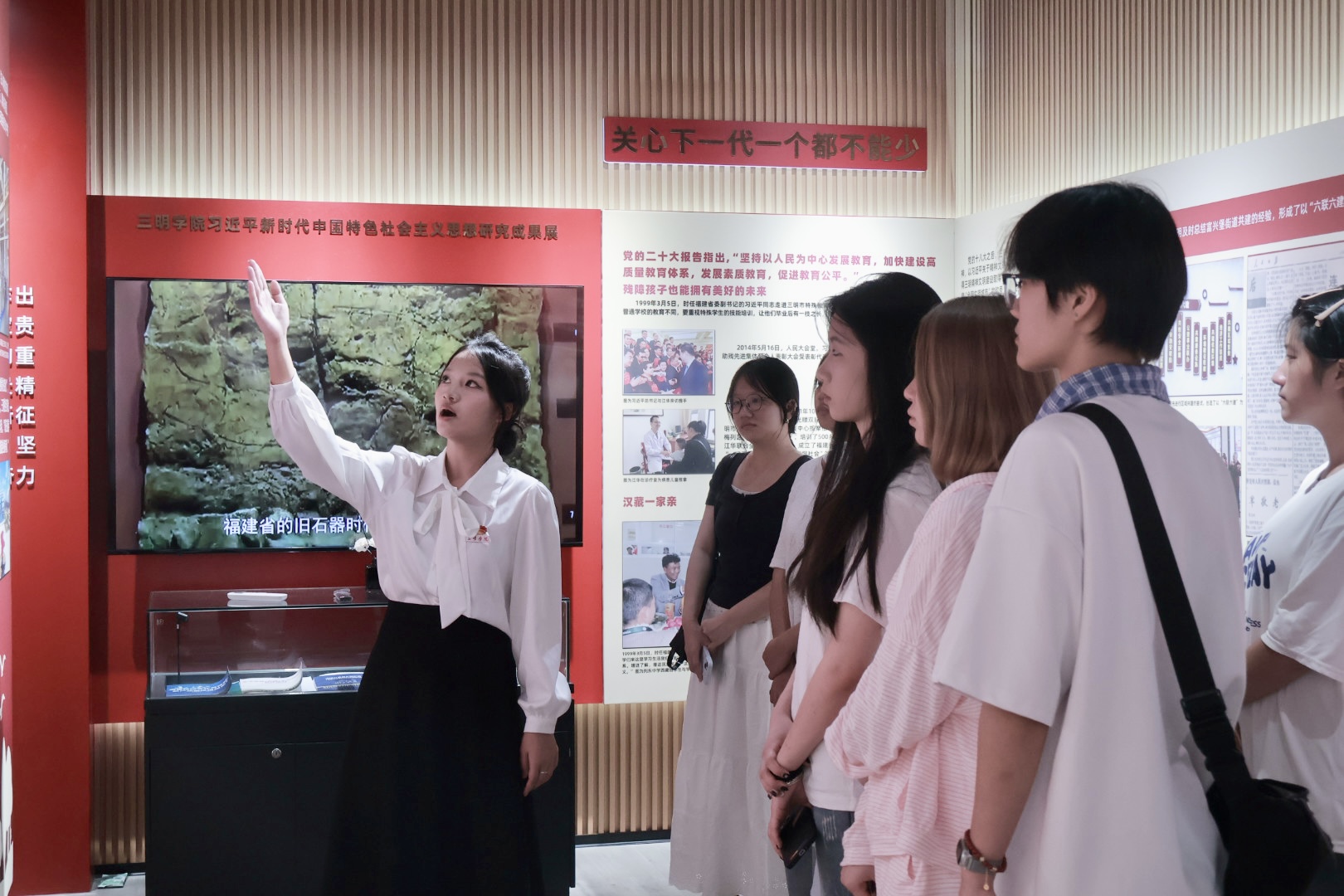 在牢记嘱托馆内,同学们沿着总书记的考察足迹参观,在展板前驻足思考。展览内容紧扣三明发展实际,生动展现了总书记的嘱托如何转化为当地发展的具体实践成果,让同学们在参观中深刻领悟习近平新时代中国特色社会主义思想内涵。