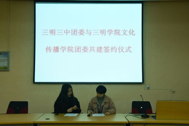 在三明市第三中学同学们的热烈掌声欢迎中,三明市第三中学的老师郑琳站上了讲台,向同学们说明了当今高考制度改革下提前做好职业生涯规划的必要性。接着,三明学院文化传播学院组织部的柯旖渊和肖紫泠同学从不同人格适合做的职业、制定总目标以及效率的重要性等方面来说明职业规划的可行性。之后,她们主要介绍了三明地区较好的高中的优缺点,以及各校开办教学的特点。还说明了中学生生涯规划的制定和实施必须要做好自我评估以及社会环境分析,确定目标之后再规划好发展路线以及行动方案,最后付诸实践。最终,在三明学院文化传播学院组织部同学与三明市第三中学老师郑琳的签约合影后,本次主题活动圆满结束。