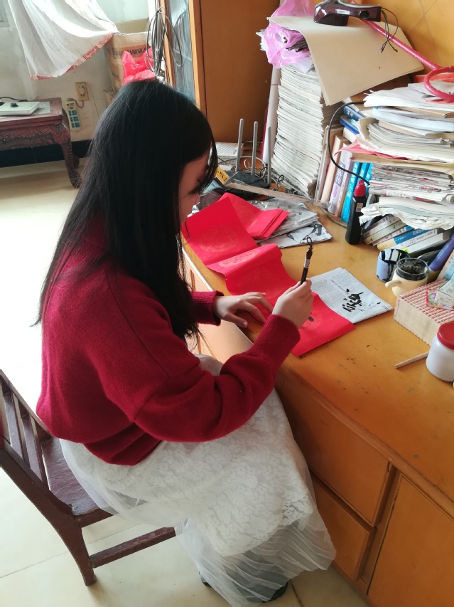“一帆风顺行大运,万事心随乐新年。”这一副春联是当日的书写内容,表达了对新春佳节的美好祝愿。积极参与乡村活动,践行党的十九大精神,把社会主义核心价值观传播进农村乡镇,把吉祥祝福送到村里的每家每户,营造猪年吉祥如意的春节氛围。这也是将自己在大学课堂中所学习到的知识应用在实际生活中,不仅是对自己课程掌握情况的一种自我检验,更是用自己的能力为村里贡献自己的微薄之力。