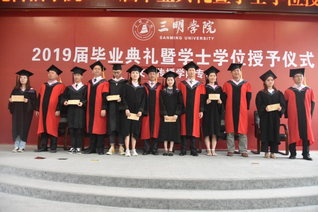 毕业典礼在慷慨激昂的国歌声中拉开序幕。院党委副书记游耿林、副院长余达忠先后宣读了《三明学院关于表彰2019届优秀毕业生、三好学生、优秀学生干部和精神文明积极分子的决定》和《三明学院关于表彰2019届考取硕士研究生同学的决定》。校党委赖锦隆副书记、院党委曾令超书记、赖祥亮院长、游耿林副书记、余达忠副院长、赵平喜副院长6位校院领导为优秀毕业生代表、考取硕士研究生的同学颁奖。随后,校院领导以及陈会明教授、邓享璋教授、蔡登秋教授、金文凯教授4位毕业生导师为全体毕业生颁授学位、拨穗正冠并合影留念。