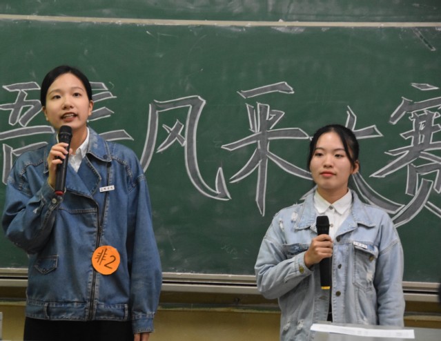 比赛期间,专业组和非专业组的选手们陆续上场,他们以多样的诵读形式诉说着对于祖国的深切热爱,以真挚的情感、扎实的诵读技巧、精湛的表演技艺充分展现了自身的实力,为观众上演了一场经典篇章的视听盛宴。聚焦于专业组选手,奥励奥组合以慷慨激昂的声调展现出对《老人与海》作品的深刻理解,用声音的力量传达出作品中人性光辉,令同学们为之动容。非专业组选手中,朗诵《采蒲苇的苇》的爱国组合,通过坚定的眼神、昂扬的激情、饱满的情感表达了对白洋淀老百姓的赞美和歌颂,赢得了在场师生的阵阵掌声。随后,由王丽老师对选手的表现做出点评。王丽老师首先肯定了选手们今晚稳健的台风和精彩的表现,接着针对不同的选手指出了部分组合存在着台位配合欠佳的问题以及选手们体态过于僵硬,不够生动的问题。