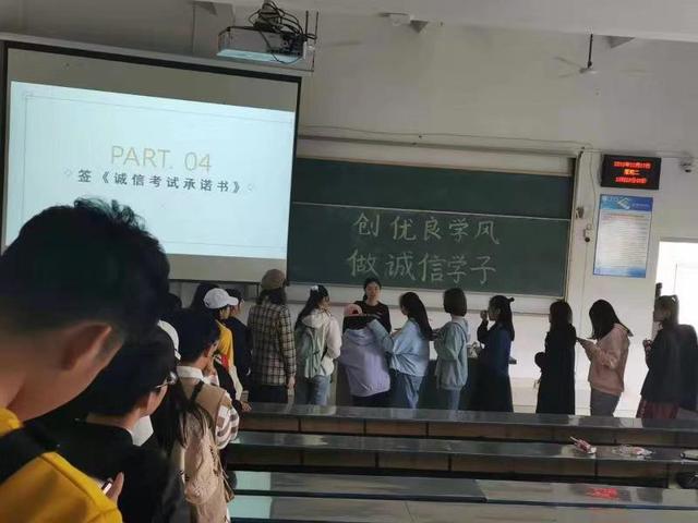 据悉,班会期间,各班组织宣读了《文化传播学院创建优良学风活动倡议书》和《诚信考试倡议书》,并由辅导员为同学们讲解《学生学籍管理办法》和《学士学位授予工作实施细则》中与考试相关的条例细则,在学院的积极倡议下,同学们还依次有序地签订了《诚信考试承诺书》。本次主题班会的召开,各班皆取得了预期目标,不仅提高广大同学们对考试作弊严重性的认识,而且做到了全面贯彻落实学校有关诚信考试的要求。