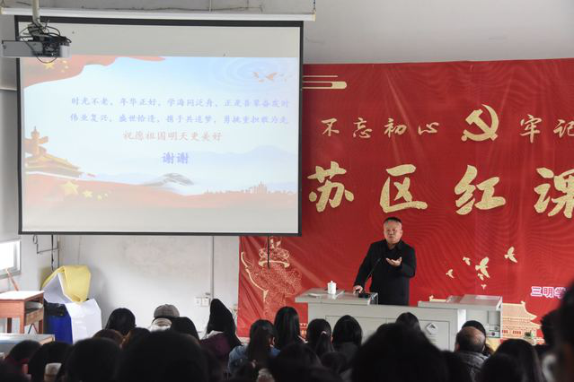 此次苏区红课堂分为三个环节。第一个环节先由我院2018级播音班苏栎荧、邹世奇、林兆琪分别讲述了《毛委员赶墟》、《红军崖》、《三明革命烈士第一村》,让远道而来的教授们了解三明红色文化,传播了三明的红色故事。第二个部分再由孙教授讲授题为“井冈山革命根据地的伟大贡献与时代价值”的专题讲座。孙教授的讲座内容分为四个部分,一是井冈山革命根据地的发展历程。孙教授围绕初创、鼎盛、曲折发展及后期斗争四个时期及主要创始人展开,生动再现了井冈山的革命斗争史。二是井冈山革命根据地的伟大贡献。孙教授对该部分进行了重点阐述,指出根据地孕育了伟大的井冈山精神,提供了党政军建设的时间范例,形成了理论新贡献。三是井冈山精神的时代价值。孙教授表明其时代价值有坚定理想信念,不忘初心、牢记使命;坚持实事求是的思想路线,积极推动理论创新;坚持依靠群众,为人民谋幸福,为民族谋复兴;坚持艰苦奋斗的作风,保持清正廉洁的政治本色。四是井冈山精神与当代大学生。孙教授希望大学生们能够志存高远、德才并重、情理兼修、勇于开拓,积极弘扬井冈山精神,做优秀大学生。