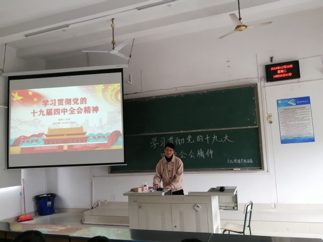 为引导学生进一步学习了解党的十九届四中全会精神,12月24日下午,文化传播学院于鸿文楼201教室召开了关于“学习贯彻党的十九届四中全会精神”的讲座。本次讲座由冯泳同学主讲,19级汉语言文学师范专业、传播学专业的全体同学参加学习。