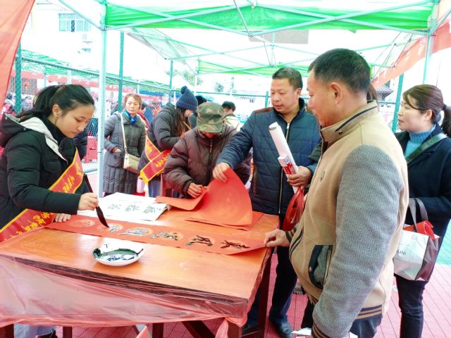 为更好地呼应示范活动主题,我校师生在三元区岩前镇政府前广场进行了写春联、画肖像活动,为镇上的居民免费写春联、画肖像。贴春联一直是欢度春节的重要习俗之一,镇里的居民听说开展了免费写春联和画肖像画的活动,便纷纷来到了现场。在活动现场,同学们不断地挥动手中笔,热情地为过往群众书写一副副满载着新春祝福的春联,绘画着一张张喜庆满满的笑脸,整个活动现场充满着新春来临之际喜气洋洋的景象。