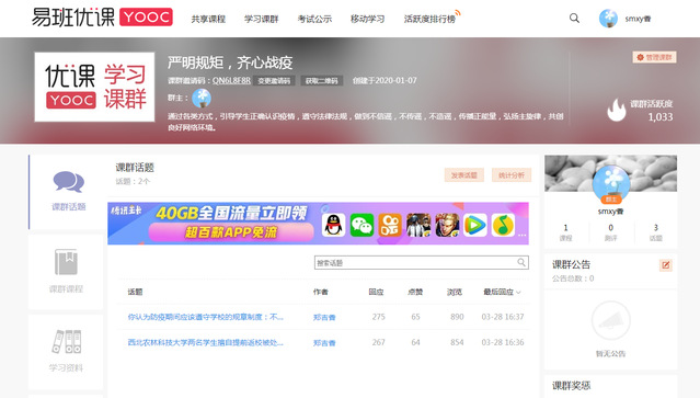 班会围绕“疫情相关情况介绍”、“疫情期间出现的谣言”、“疫情期间的预防”这三个方面展开。借助易班优课平台,将PPT、视频、文档等相关材料上传至课群并组织同学们自主参与学习,号召同学们通过学习认识到疫情期间“严明规矩”的重要性,从而做到遵守法律法规,合理利用好各类社交平台,不造谣、不传谣、不信谣。