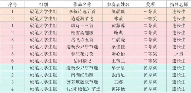 在第五届中华经典诵写讲大赛“笔墨中国”汉字书写大赛评比中,由连长生老师指导的文化传播学院学生施晨瑶作品《李贺诗选五首》、林璇作品《逍遥游节选》荣获一等奖;由连长生老师指导的黄薇蓉作品《唐诗十三首》、施琪作品《松雪斋题跋》、江晨晓作品《岳飞诗五首》、梁佳佳作品《送杨少尹序节选》、王钰兰作品《岳阳楼记》,罗男老师指导的陈心怡作品《春江花月夜》荣获二等奖;由连长生老师指导的牟子晗作品《送杨少尹序节选》、张洁尼作品《南湖红船赋》、王娜作品《苏东坡题跋节选》、黄冰艳作品《岳阳楼记》节选荣获三等奖。