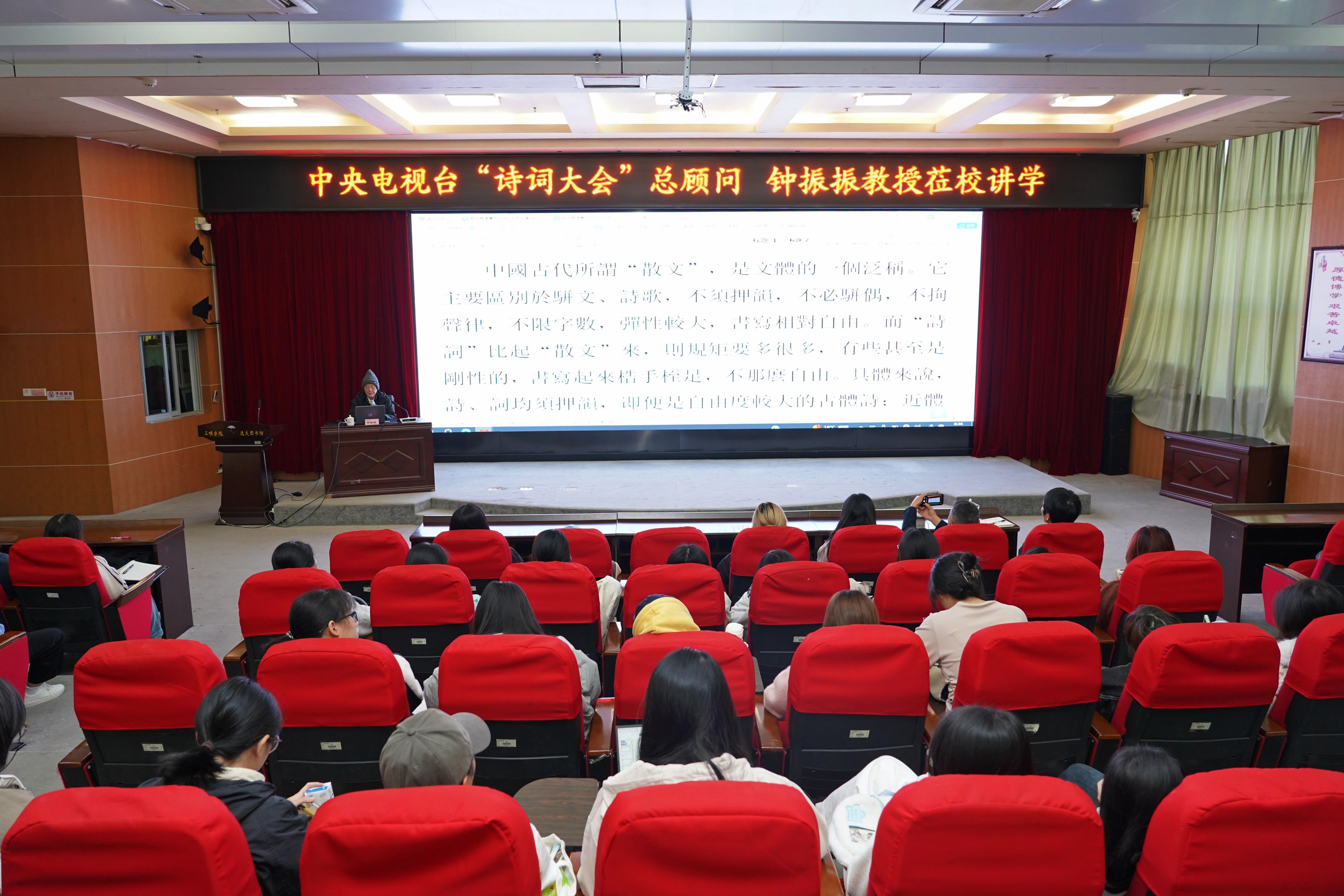 钟振振教授从文学作品“文本解读”、“艺术分析”、“审美判断”的阅读三个要素开讲,指出文本解读有作者定位和读者定位两种类别,并提出“诗词是人们公认最难读懂、误读率也最高的一种文体”的观点。他细致分析了散文和诗词两类文体的语言表达特点,并以散文和诗歌的不同特性引出“散文阅读惯性与诗词文本误读”这一主题。他通过详细分析王质的《倦绣图》、王昌龄《从军行》,说明套用散文语法来解读诗歌会造成误区,从而点明诗词受制于格律、对仗等形式上的要求,往往会出现不同于散文语言表达的语法变态,产生语词顺序错位等情况。他还生动解读了辛弃疾《木兰花慢》和杨万里在《初入淮河四绝句》中隐藏的深意,指出诗歌由于篇幅制约,经常大量省略句子成分乃至成句成段省略文意,因此诗词阅读难度高于散文,所以用散文的阅读习惯解释诗词,就容易出现对诗词文本的误读。他强调读者要敢于提出自己不同于知名注家的新解,需跳出“散文阅读惯性”来进行诗词文本的解读。他说,散文是把米煮成饭,诗词是把米酿成酒,散文是长镜头,诗词是蒙太奇。他的报告,深入浅出,将理论分析和案例讲解相结合,语言生动幽默,分析富有启发性,为师生们送上一份富有贴近性、思辨性和指导性的诗文阅读“营养大餐”。广大师生从中接受了一次古典诗词的熏陶,对提高自身的古典文学素养大有裨益。
