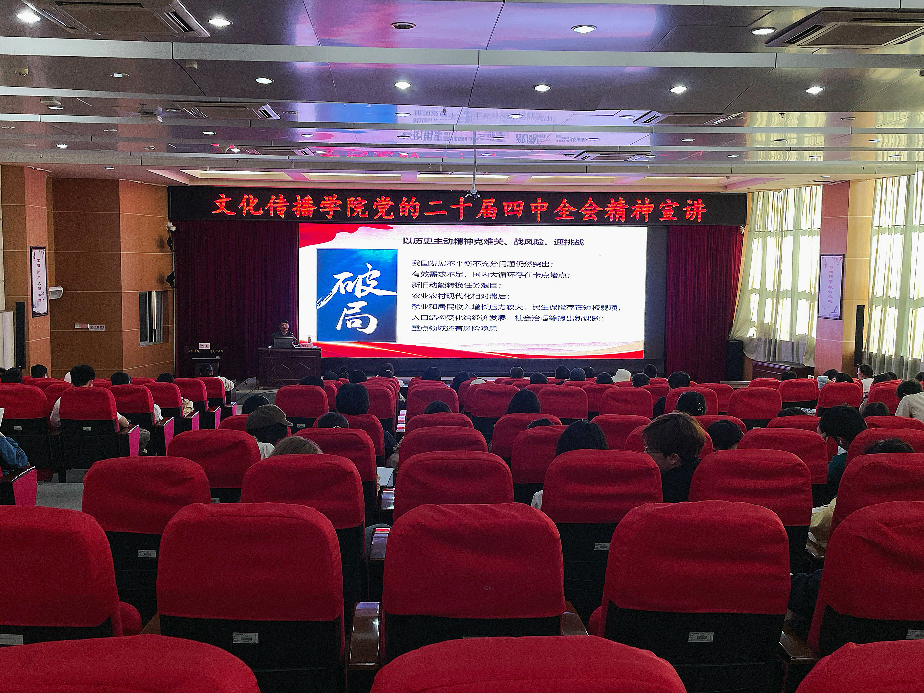 12月10日下午,文化传播学院在逸夫图书馆报告厅隆重举行党的二十届四中全会精神宣讲会。马克思主义学院副教授陈绍西受邀主讲。