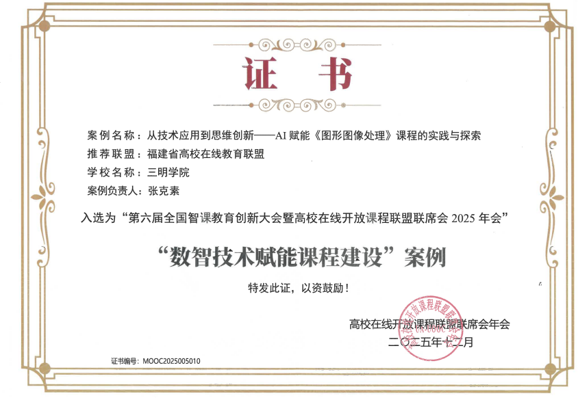 在本次大会征集的“数智技术赋能课程建设”专项案例中,文化传播学院张克素老师申报的《从技术应用到思维创新——AI赋能<图形图像处理>课程的实践与探索》案例成功入选,并在大会现场进行重点展示,获得与会专家的关注与认可。该案例立足《图形图像处理》课程教学实际,系统梳理了人工智能技术在重构教学目标、优化教学内容、创新教学模式、优化评价机制等方面的应用成果,为同类课程的数智化升级提供了可借鉴的实践经验。