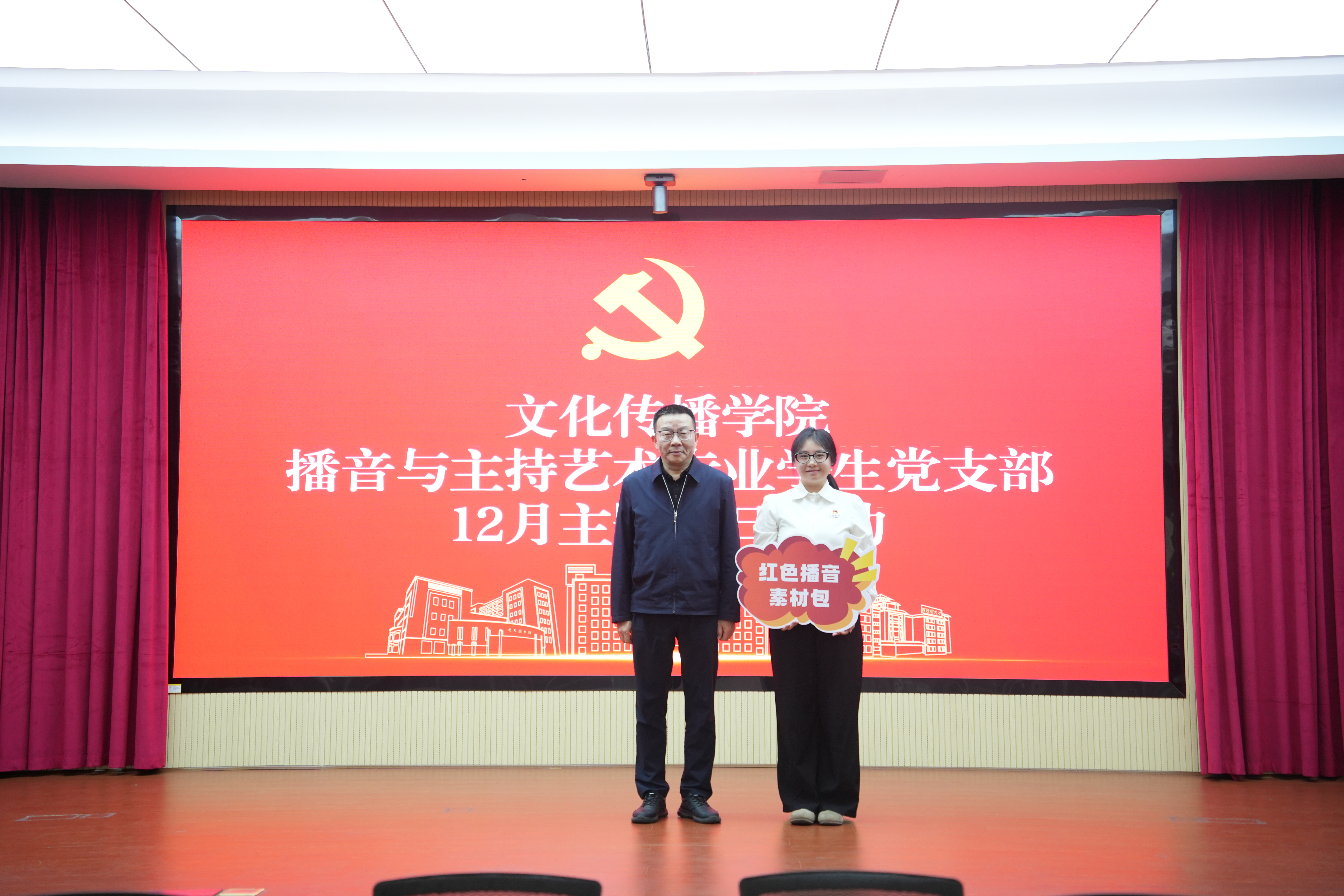 活动中,校党委廖景榕副书记向支部赠送“红色播音素材包”,鼓励同学们充分用好专业资源,深耕红色文化土壤,用心用情讲好党的故事、革命的故事、英雄的故事。支部代表肖烨辰同志郑重接过素材包,并表态将以这份关怀为动力,持续精进专业能力、锤炼党性修养,不负期望、勇担使命。