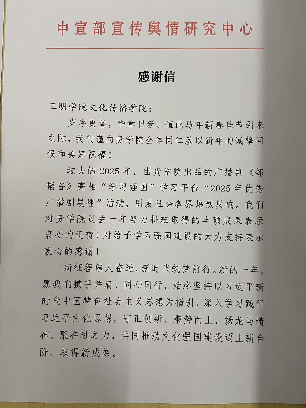 近日,中共中央宣传部宣传舆情研究中心、“学习强国”学习平台向三明学院文化传播学院发来感谢信,对学院原创广播连续剧《邹韬奋》在“学习强国”2025年优秀广播剧展播活动中引发热烈反响给予肯定。